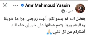 هذا و أعلن زوجها، الكاتب عمرو محمود ياسين، عبر حسابه على فيسبوك عن خضوعها لجراحة دقيقة استمرت لأكثر من خمس ساعات. كتب قائلاً: “بفضل الله ودعواتكم، انتهت زوجتي من جراحة طويلة ودقيقة، ونسأل الله أن يتم شفائها على خير. شكراً من أعماق قلبي.”