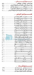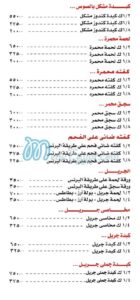 – مجموعة متنوعة من السلطات بسعر 25 جنيهًا للطبق الواحد وتشمل: سلطة بابا غنوج، سلطة الطحينة، سلطة الطماطم، السلطة المشكّلة، وسلطة الفلافل.