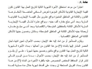 ينص القانون في المادة 4 على كيفية تطبيق الزيادات المقررة على وحدات الإيجار القديم، بالنسبة إلى الأماكن السكنية، تكون قيمة الإيجار 20 ضعف القيمة الإيجارية الحالية، على ألا تقل عن ألف جنيه كحد أدنى.