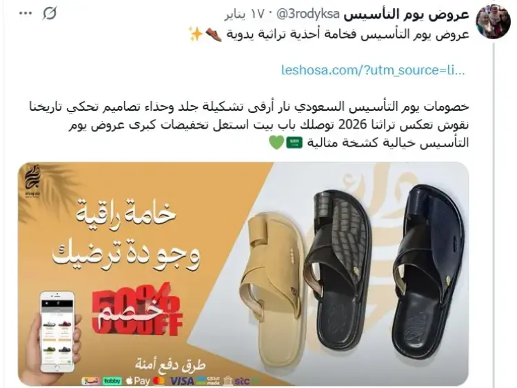 مؤسسة جند وجلد المعروفة بالأحذية الفاخرة قدمت خصومات تصل إلى 50% على مجموعاتها من الجلد الفاخر والأحذية التراثية اليدوية التي تسرد حكايا غنية بالنقوش المستوحاة من التراث.